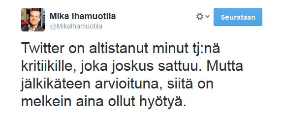 Monet pelkäävät Twitteriä ja somea. Syynä on usein a) kritiikin pelko ja b) maineen menettämisen pelko. Miksi kritiikkiä pitäisi pelätä? Sen avulla voi kehittää omaa ja organisaation toimintaa. Ja maineen menettäminen on ehkä vähän kaukaa haettua. Voidaan myös kysyä, voiko mainetta ylipäätään hallita. Jos Marimekon toimitusjohtaja Mika Ihamuotila uskaltaa olla avoimesti Twitterissä, niin miksei sitten tavallinen järjestöjohtajakin.